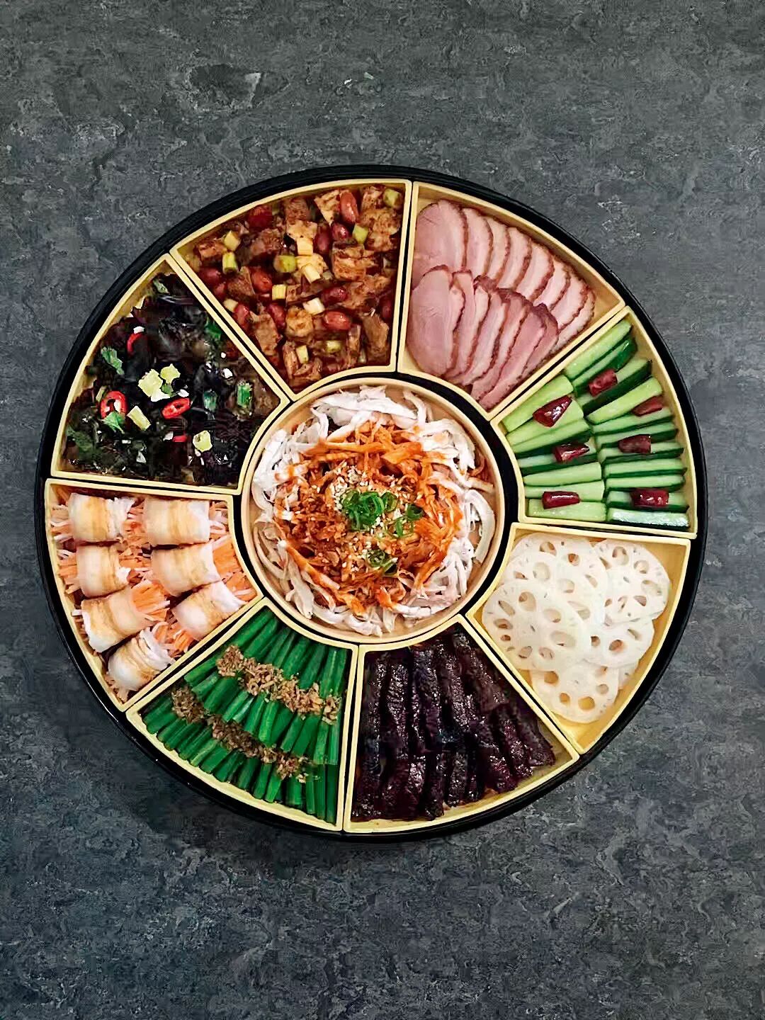 扶霞用90年代购于成都的攒盒制作承装了怪味鸡丝、姜汁豇豆、麻辣牛肉干、蒜泥白肉、二姐兔丁、樟茶鸭、炝黄瓜、珊瑚雪莲和酸辣木耳