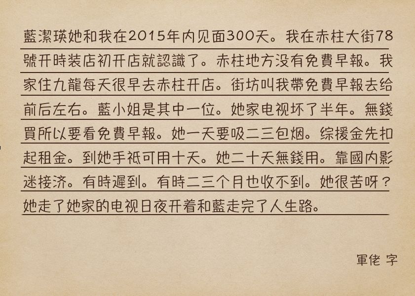 差不多一个月之后,她很早来,问我店里的免费报纸可不可以送给她一份。我说你不是不看报纸吗?那时负面东西很多。她说现在我要看了,家里的电视坏了半年多了。单身的女人独居,晚上没有电视,很寂寞。从那之后她每天早上来我店里拿免费小报。我心想,真可怜,电视也没有,又没有钱,我说你这样子怎么过日子啊?