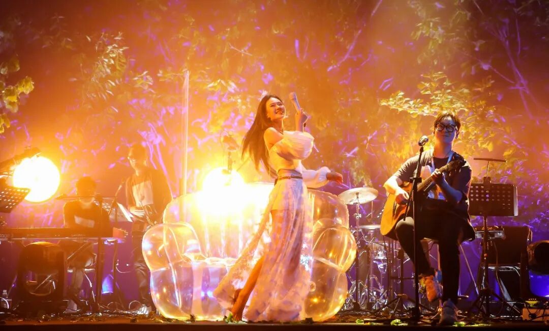 演出当天,她融进了那片音乐森林。下半场开始,她没有接过工作人员准备好的高跟鞋,而是直接跑上舞台,倚靠在透明充气沙发,晃荡着脚丫,唱完了歌。接着索性喊导演撤走椅子,光脚满舞台地跑,穿着白纱裙坐在地上。