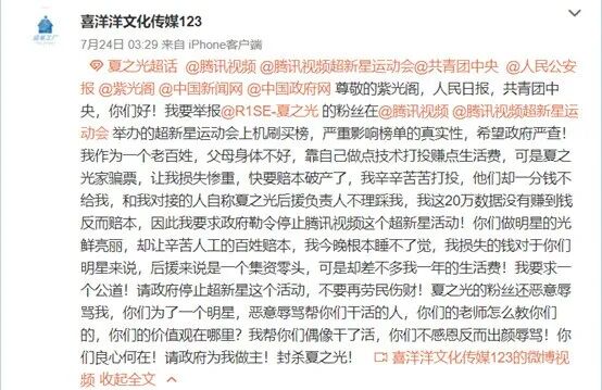 同时,灰色产业不受法律保护,被拖欠款项也是常事。就在7月24日,某个水军公司因为在为某艺人进行刷榜后讨酬未果,愤然将交易过程向公众曝光,让网友吃了个大瓜。