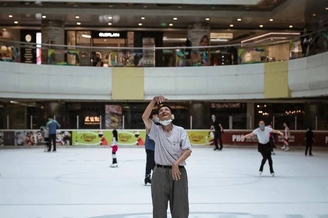 在高效又忙碌的北京CBD,位于国贸一期的地下冰场是一处稀有的放空之所,800平米的冰面像一个巨大的漩涡,能把人的精神短暂地吸入进去。等午休时间一到,那些放空的人聚集起来,就都成了劳伦斯先生的观众。