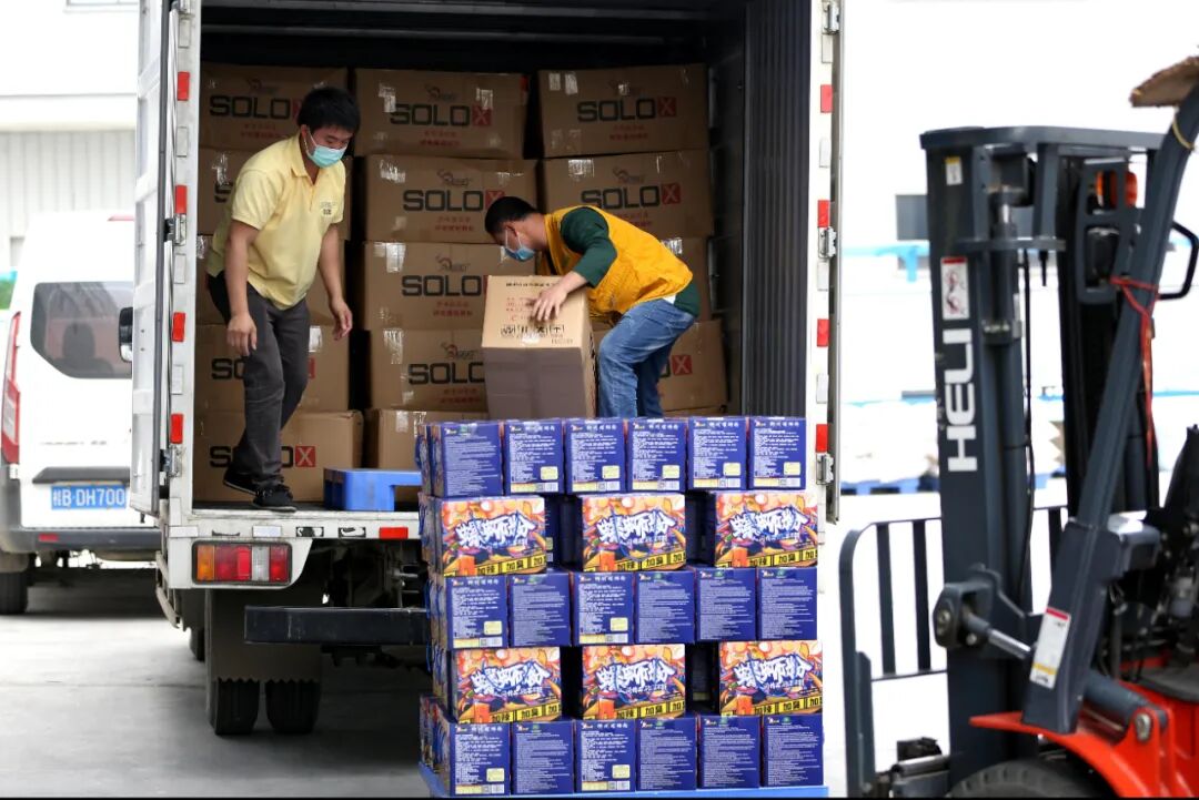 2020年3月,工作人员搬运螺蛳粉。3480袋柳州螺蛳粉从广西柳州市发出,四五天后将到达新加坡图源视觉中国