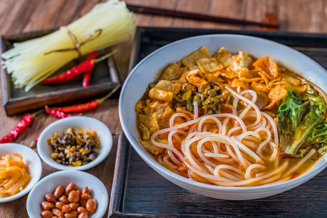在柳州,螺蛳粉是一种特色小吃,它的汤料由螺蛳和多种香料熬制而成,煮成后只取汤不要肉,加入干米粉煮熟后,搭配油炸腐竹、花生、豆角,还有酸笋一起食用。