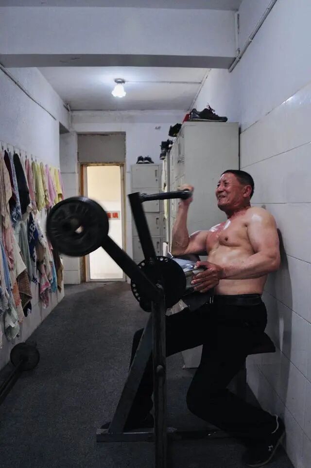 来健身的几乎都是50后、60后的男人。78岁的汤根元是这群人里年龄最大的,能卧推240斤重量,胸肌会抖动。这里练法简单,西裤皮带、牛仔裤、皮鞋是常见的运动装备。「就是铁,你们年轻人叫『撸铁』『硬核』。」53岁的周中华习惯穿紧身衣,因为肌肉发达,他很难买到适合大臂维度的上衣。