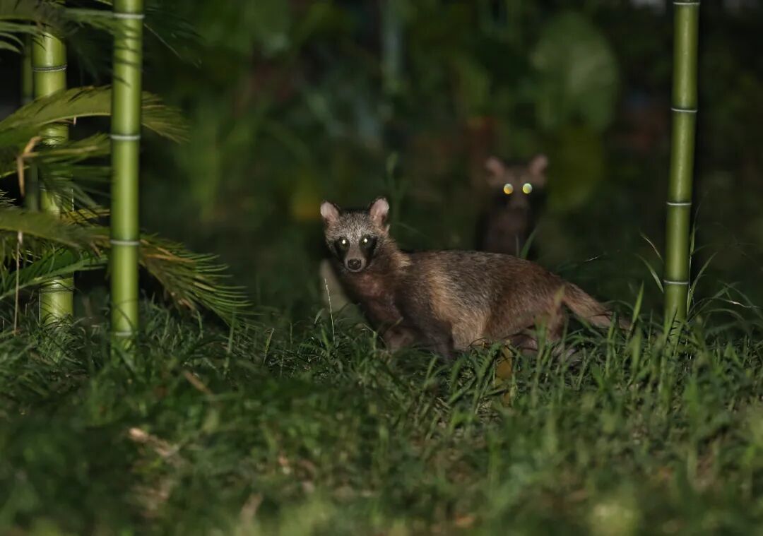虽然黄鼠狼长得可爱又灵巧,但貉才是城市动物里最精明的玩家。它的脸像浣熊,体型和中型犬差不多,周身披着黑色和灰色的毛发,这便于它在夜晚游荡。据王放的统计,上海至少有60到80个社区都有野生貉存在。