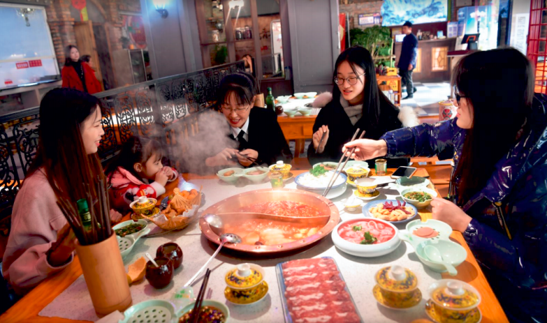 冯小琴跟自己的女儿、侄女一起吃火锅