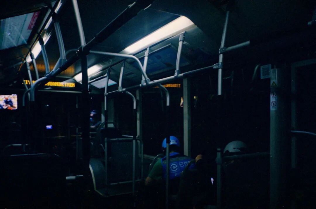 那个画面感挺强的,车里面很暗,黑着灯,每个人那儿都一小撮儿亮,大家都在看手机,基本上都是要么看抖音,要么看快手,他们不戴耳机,声音外放,混杂着夜公交自己播放的轻音乐,环境嘈杂,但是所有人都沉默,不说话,形成巨大的反差。
