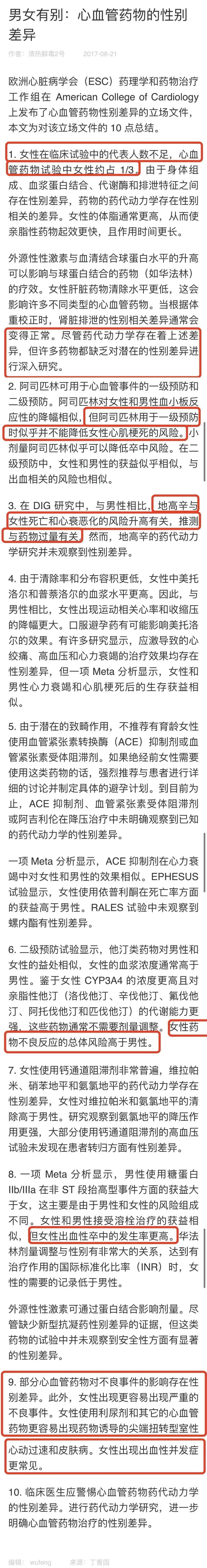 丁香园编译 ESC 的心血管药物性别差异的立场文件