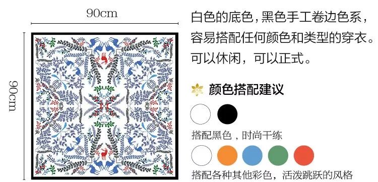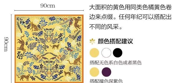 这三款丝巾都是90厘米的经典方巾尺寸,适合多场景佩戴。设计师原创手绘图案,也可作为艺术品用画框裱起来,装饰房间或用来收藏欣赏。
