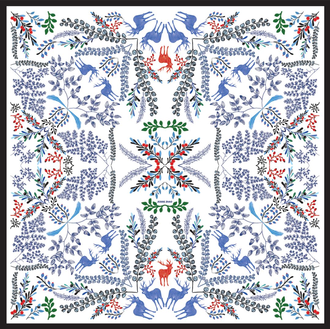 她的丝巾上很少会出现「人」,属于大自然的草叶、枝条、花朵、动物,才是她丝巾设计中的常用元素。通过翻转、对称的方式,花草树木和生灵在大片的蓝和绿中互相交叠、映照,丝巾上的整幅图案变得平静、和谐,只有一片原始、狂野、静谧的大自然。