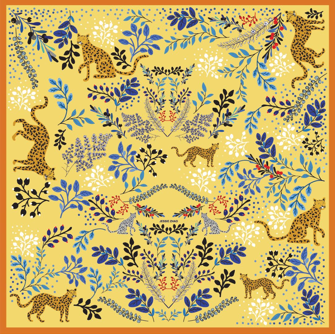 华裔女设计师Jessie Zhao擅长在约一米见方的丝巾上创造魔幻世界。在她的丝巾上,猎豹在水面轻盈漫步,星空是一片丰收的田畦,亚洲象群在漫天飞舞的羽毛和芭蕉叶中行进,长着翅膀的龙盘旋在城堡上空……