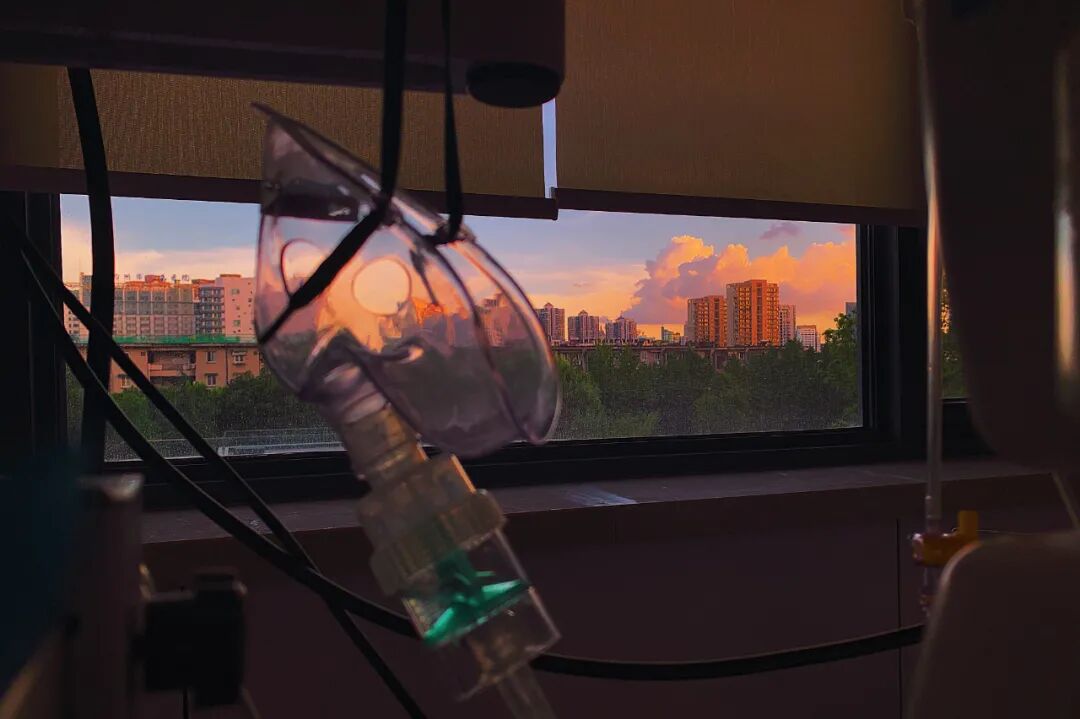 关于医院,小范最喜欢的一张照片是在ICU拍的。镜头的焦点是一个吸氧面罩,面罩后边是ICU的透明玻璃窗,窗外渐次是绿树、楼宇、云朵和天空,一块透明玻璃隔开了两个世界。小范至今还记得这位面罩的主人,这是他在ICU送走的第一位患者。