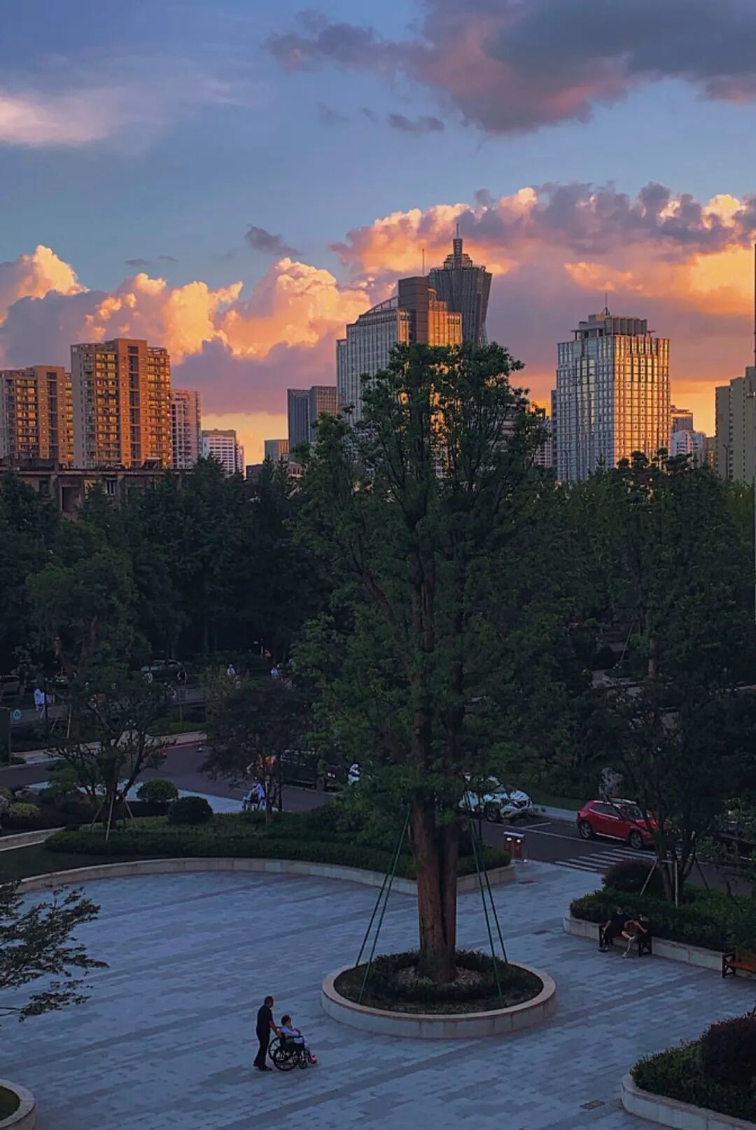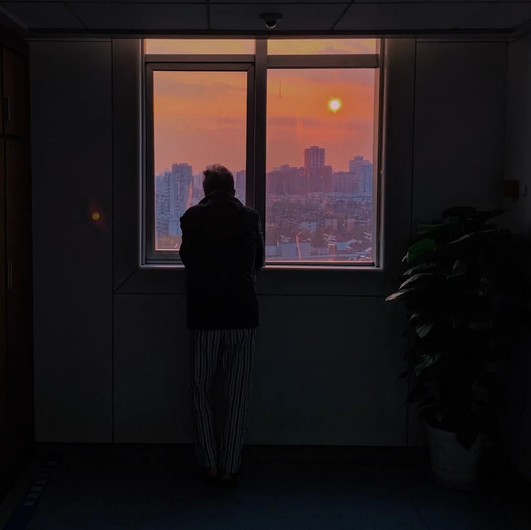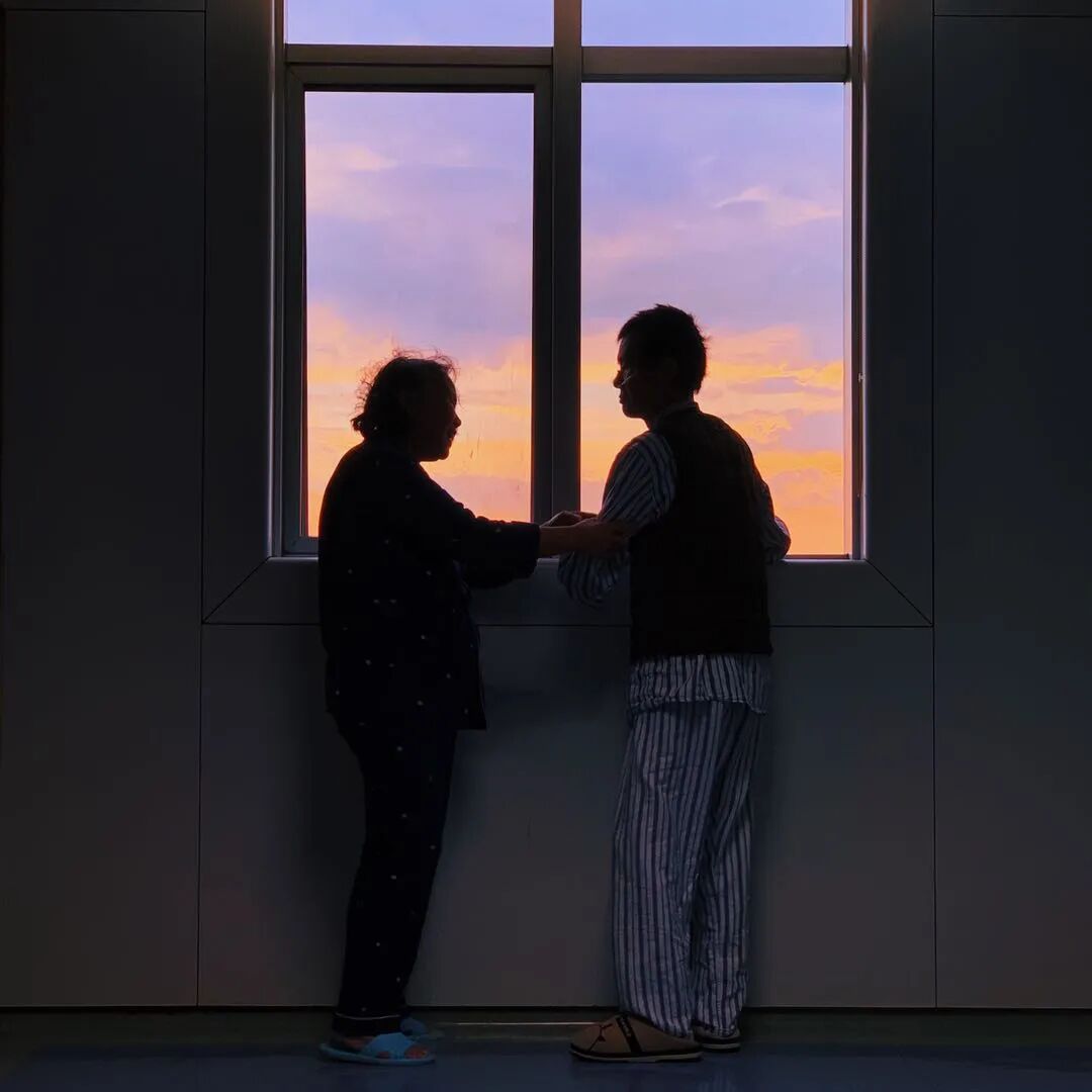 他曾经拍过一组照片,上了微博热搜。他将镜头对准医院的一扇窗,窗户朝西,旁边就是上塘高架,透过那扇窗,能看到晚霞、夕阳、居民楼和绿树,许多病人在走廊散步时,都会走到那扇窗户旁站一会儿。病人趴在窗前,留了个背影,窗外是暖黄色、靛蓝色、粉紫色的光,感觉像幅画。