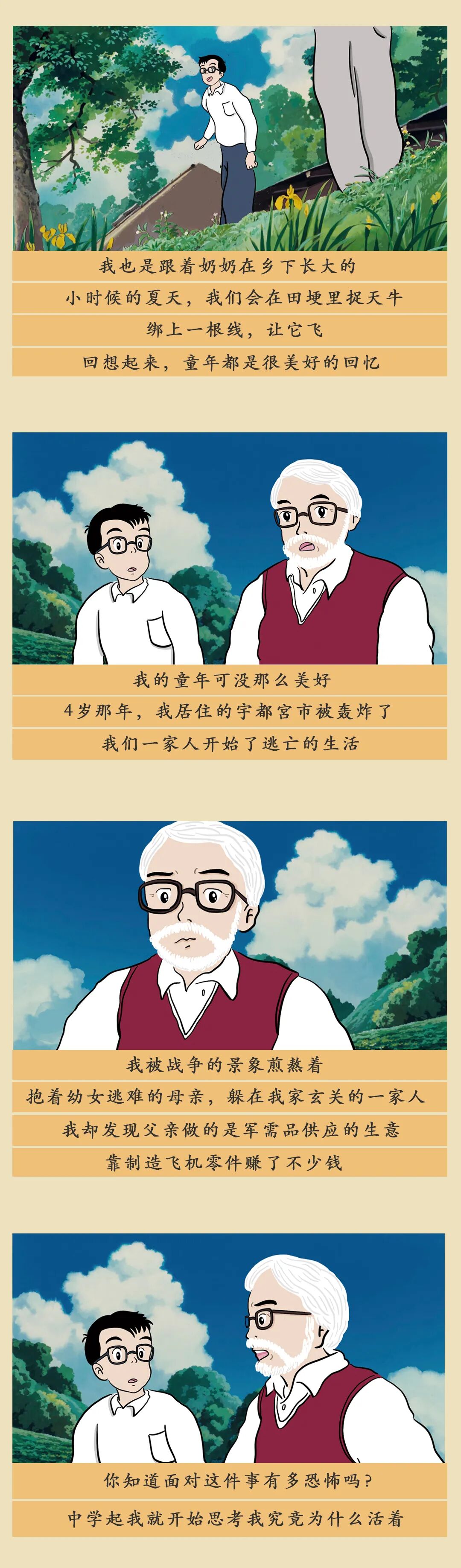 作品里拥有夏天般明亮色彩的人,童年却是灰色的。患有脊椎病的母亲长年卧床不起,甚至不能给小宫崎一个拥抱。4岁开始,战争爆发,宫崎骏一家在战火中颠沛流离。逃难中,一对母女向宫崎骏一家乘坐的货车跑来,「请载我们一程吧」,但车就这样开走了。