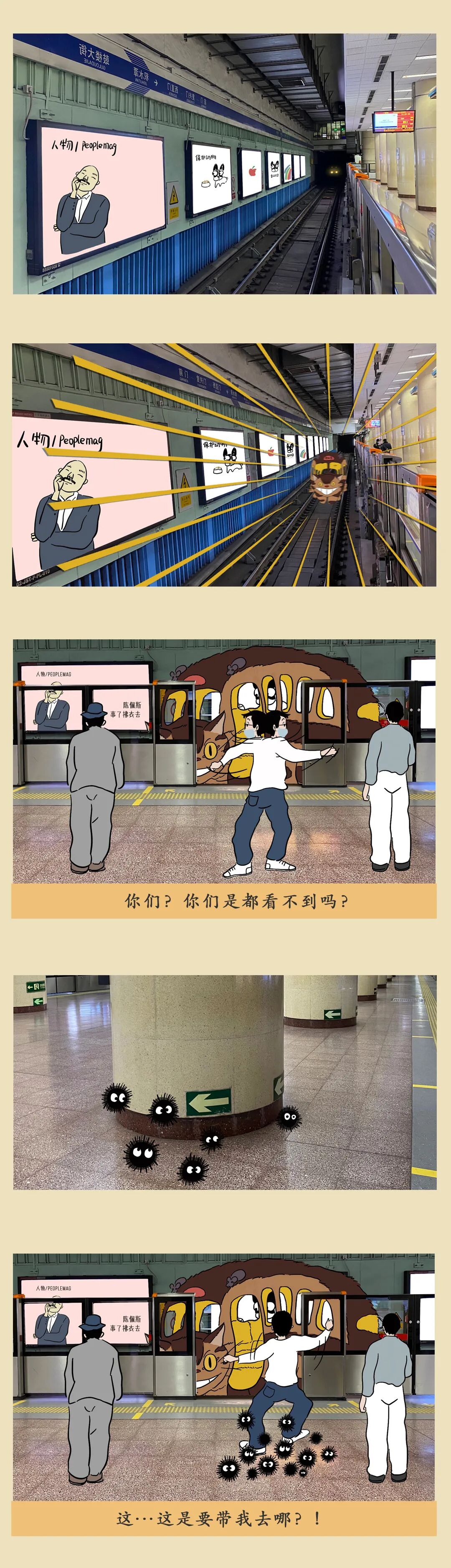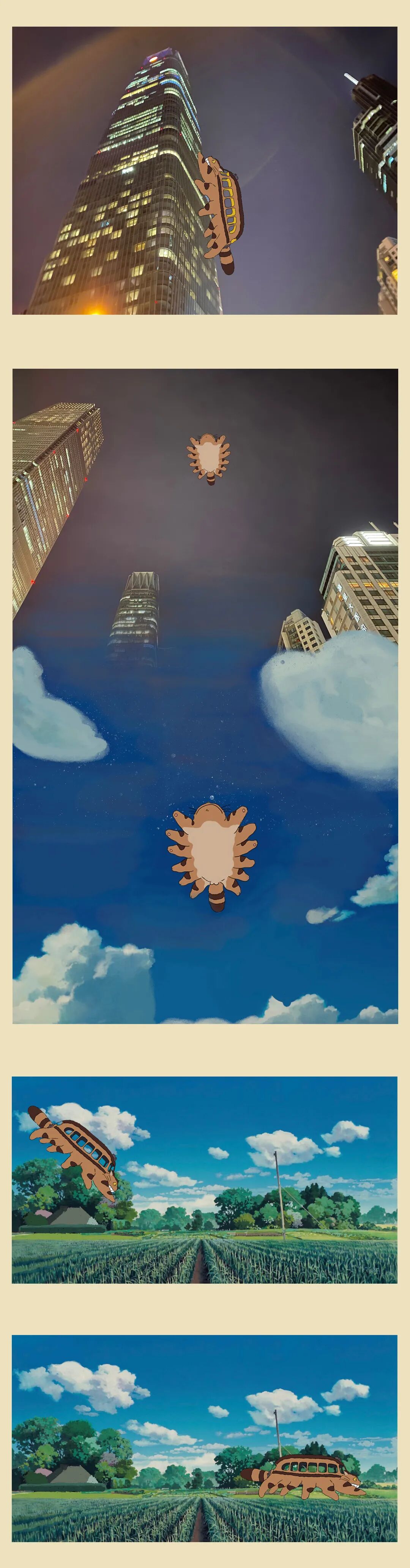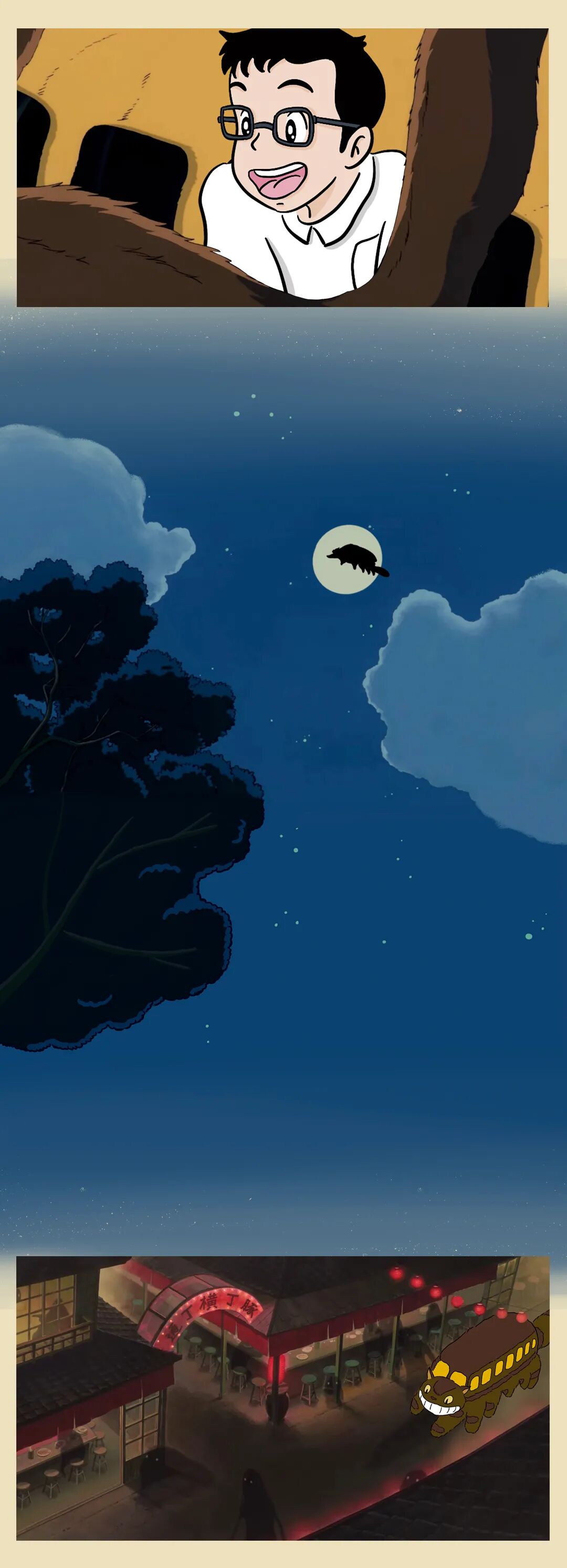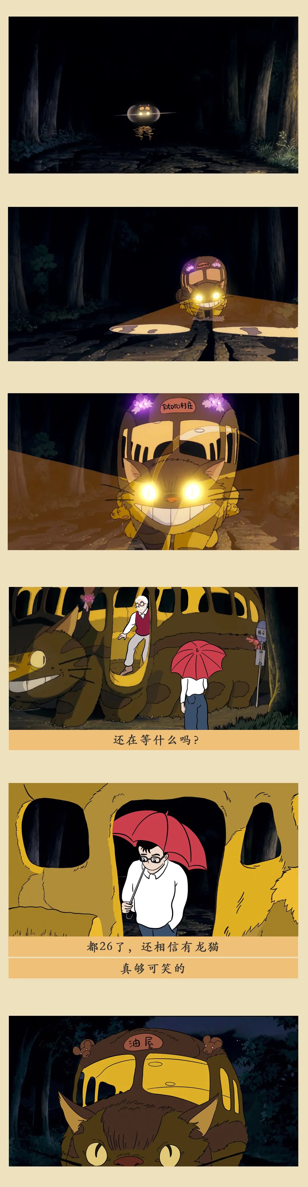 不仅是对童年的怀念和重温,我们更想强调「相信」——保留清新的想象力和好奇心,相信油屋和木灵真的存在,相信纯真和善意会得到报偿,相信繁杂的工作之外,当我们抬起头,会看见楼宇长出大树,龙猫坐在树梢,而猫巴士在空中飞翔。