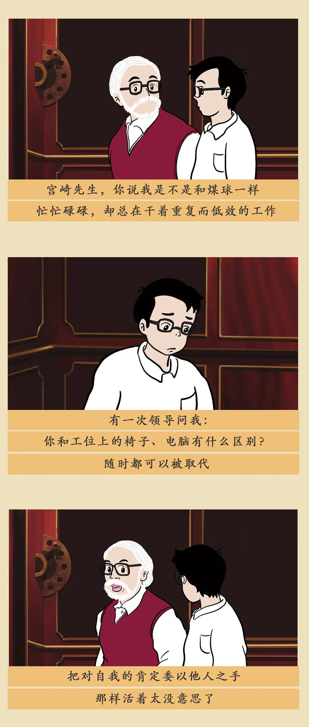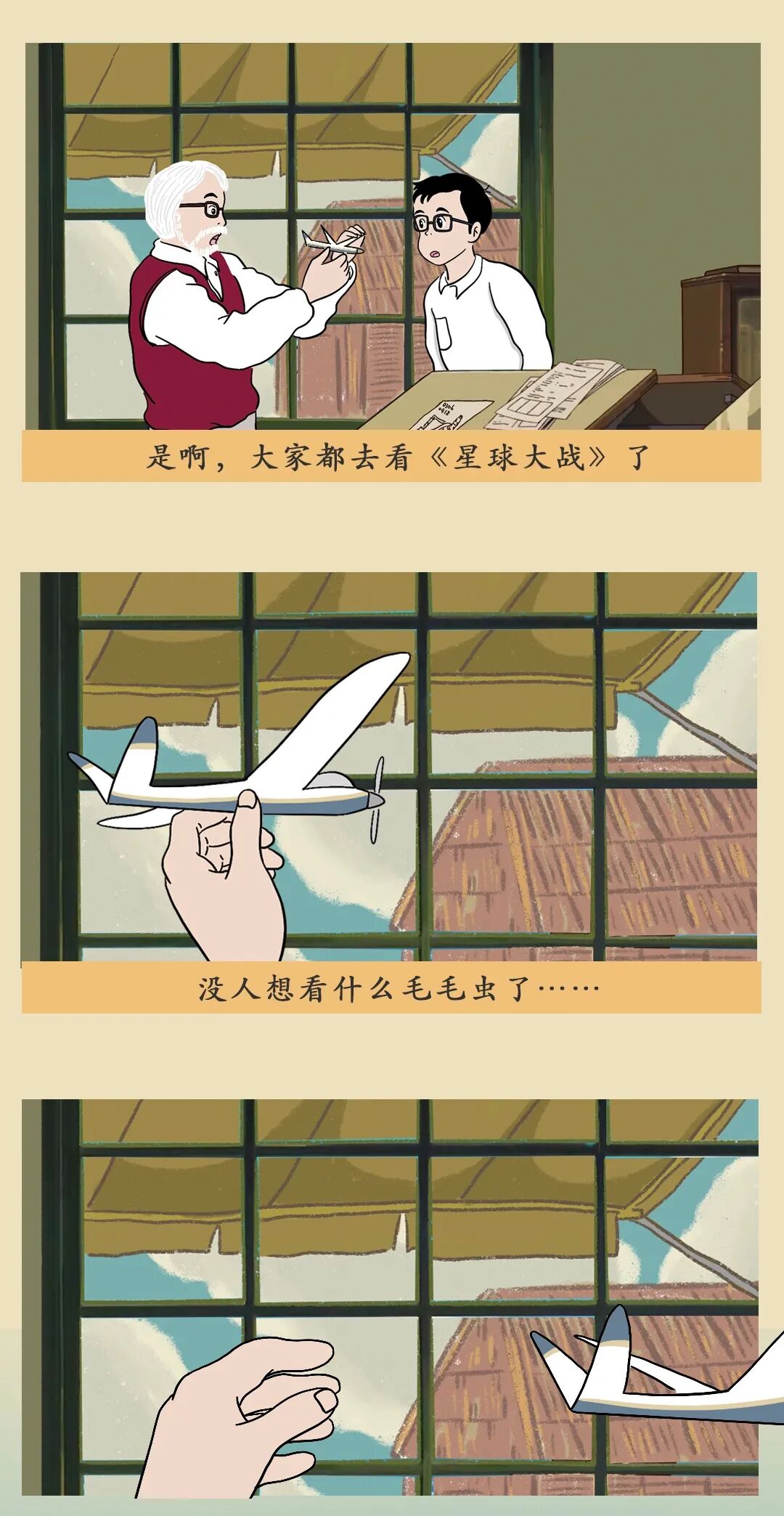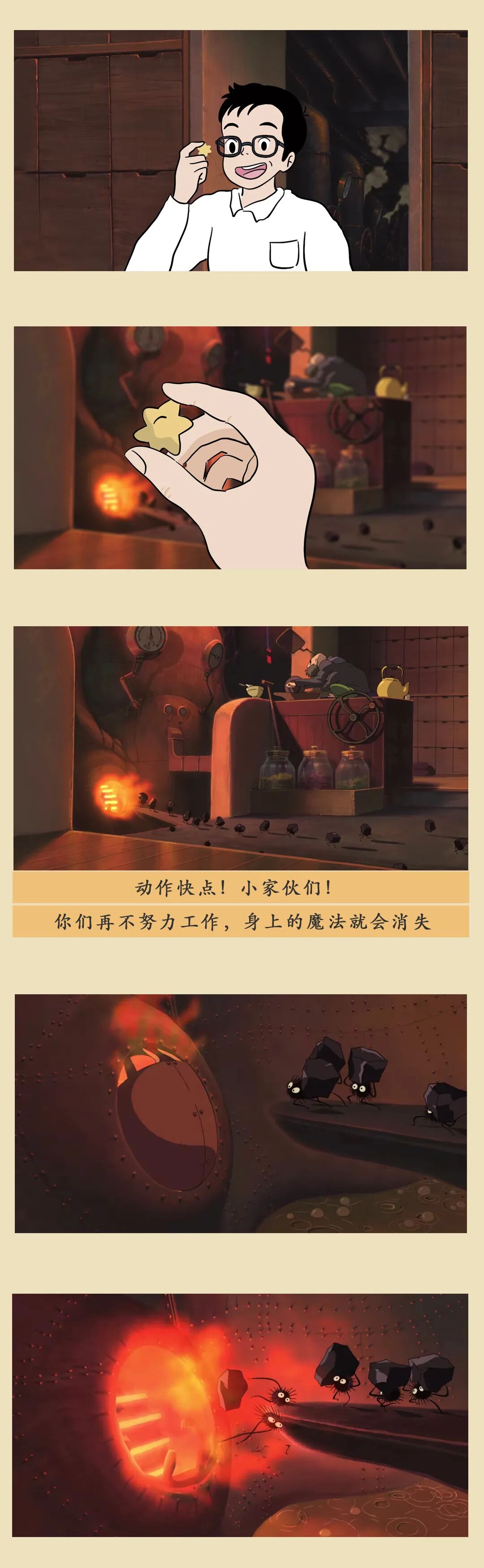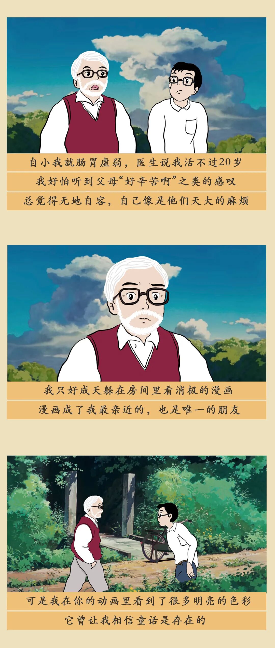 但想象力也有消失的危险。成年以后,我们努力做个大人,为生活奔波,时而陷入焦虑、迷惘、自我怀疑。我们将这样一个普通的成年人纳入到故事中,与宫崎骏一起完成了这趟旅程。