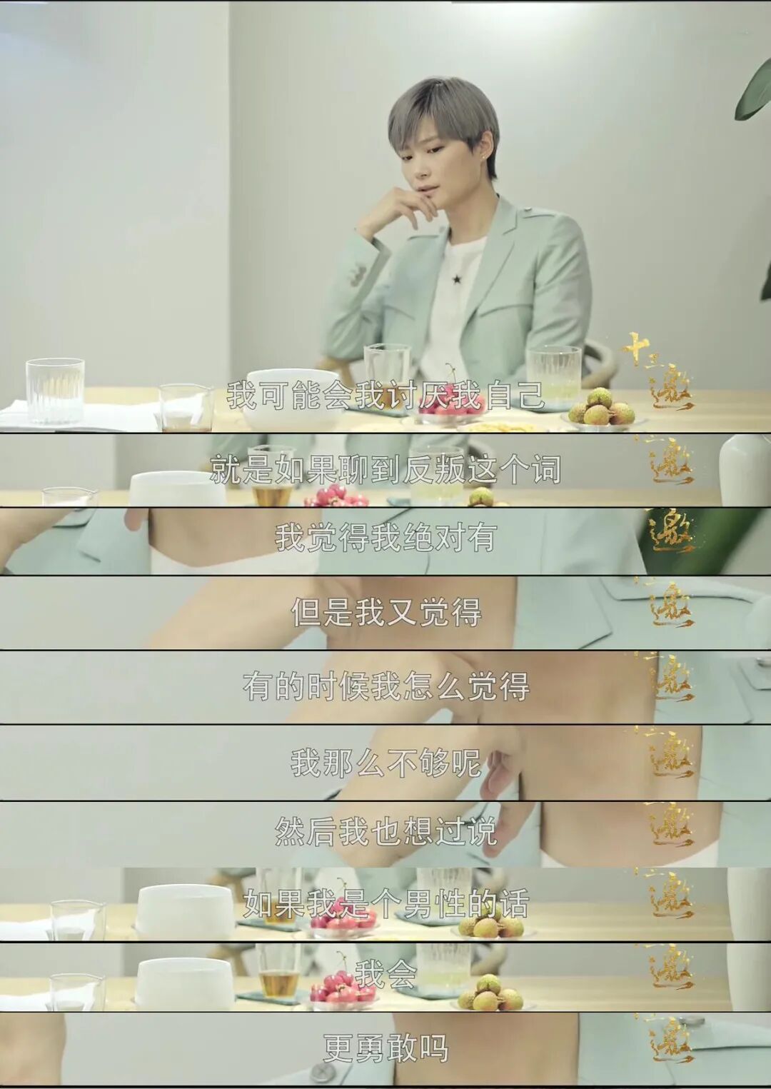 采访也更愿意打开了。她聊到自己变化的原因,「可能是内外更加统一了,更愿意做自己,而不是别人期待中的自己。」之前《十三邀》许知远的采访里,她坦言自己不够反叛,如果李宇春是个男孩会不会更好?但今天,这个问题她有新的思路:「正是因为李宇春的女性身份,我觉得她才有意思,这个人物才有意思,她才特别啊,她才有她的意义。」