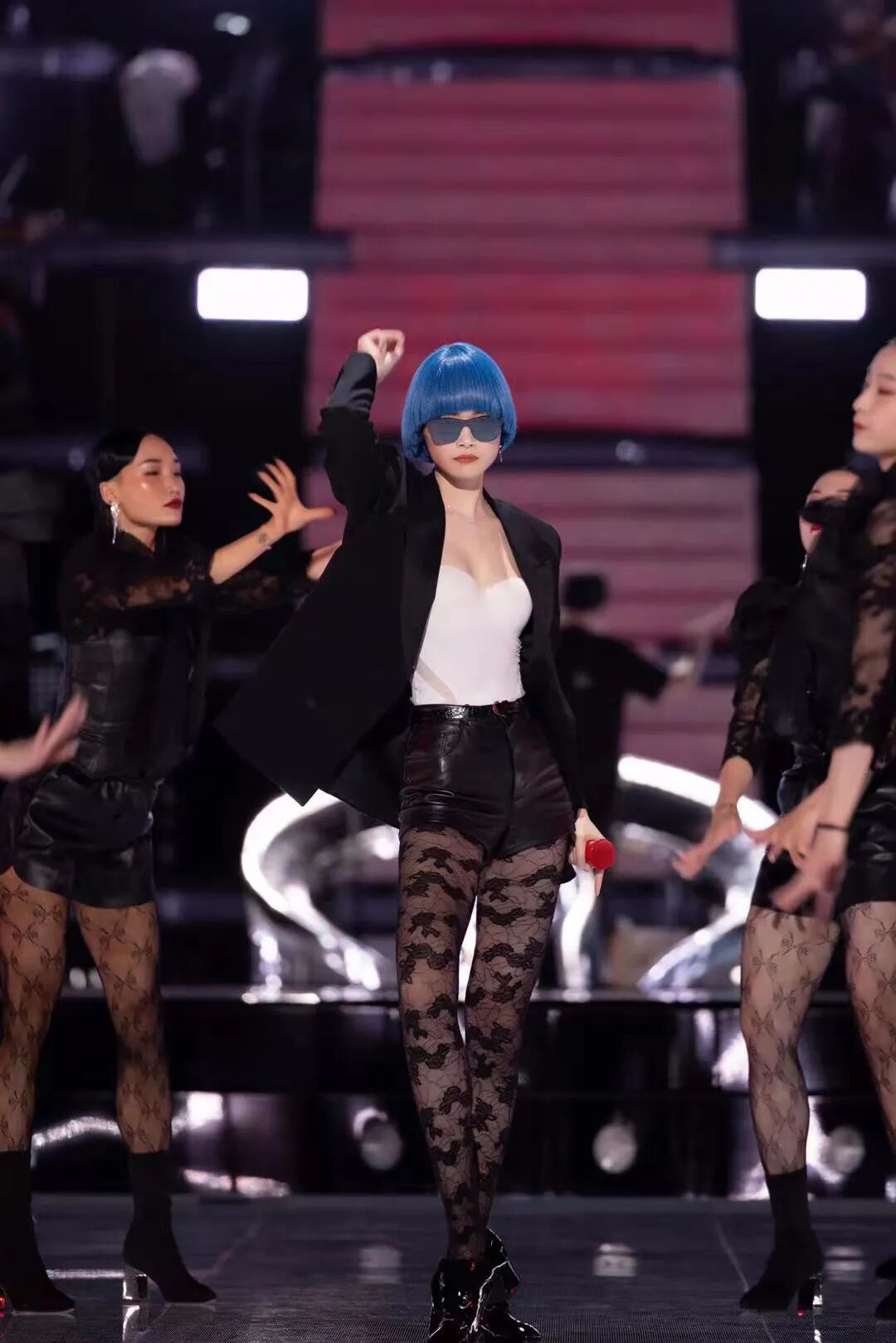 她变得越来越「敢穿」。演出衣服是一件西服里面配着抹胸,或者是一双黑色蕾丝袜,动作也是柔软,透着妩媚。——「也是活久见。」她自己调侃。这个夏天,她居然戴着夸张眼镜和蓝色假发,为《乘风破浪的姐姐》演唱自己作词的《无价之姐》,一首接地气到几乎所有人都可以哼唱一段的歌曲。