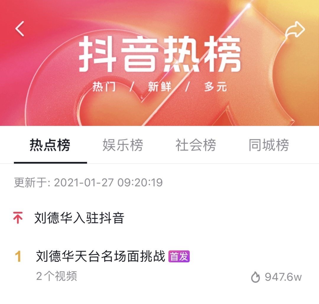 1月27日,刘德华入驻抖音,开通自己全球第一个社交媒体账号,入驻24小时粉丝量即破2463万。第一条视频,是他在镜头前复刻《无间道》的经典桥段,改编他和梁朝伟在天台的对手戏,「以前我没得选择,现在我想开抖音」。#刘德华天台名场面挑战 迅速登上抖音热榜榜首。在评论里,贾玲、薇娅、陈浩民等纷纷留言,#贾玲抢刘德华热评 也很快登上了热搜。在这个明星云集的世界里,应采儿、张艺兴、蔡少芬、邓紫棋等纷纷发布视频欢迎华哥入驻,应采儿更是放出了曾经和刘德华演戏的片段,蔡少芬在镜头前大喊「华仔我爱你」,张艺兴则用刘德华的歌词快问快答。「爱」的箭头都是双向的,对于众多明星朋友们的欢迎,刘德华也亲自下场互动,全世界最暖的华哥无疑。
