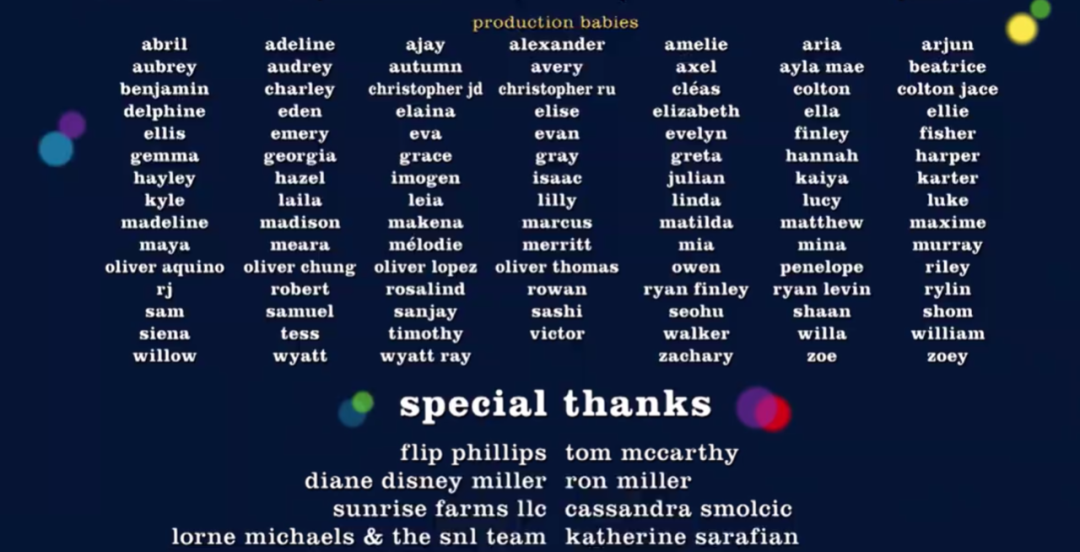 由于皮克斯影片的演职员字幕通常格外冗长,如果你有等所有字幕都播放完毕再离场的习惯,那你可真的需要等很久。而如果你认真看演职员表,会发现其中有一个有趣的彩蛋——「Production babies」,下方陈列着的名字就是在这部电影制作期间,工作人员生的宝宝的名字。