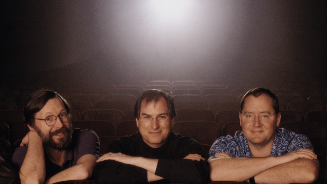 从左至右分别是埃德·卡特穆尔、史蒂夫·乔布斯与约翰·拉塞特图源《皮克斯的故事》(The Pixar Story)