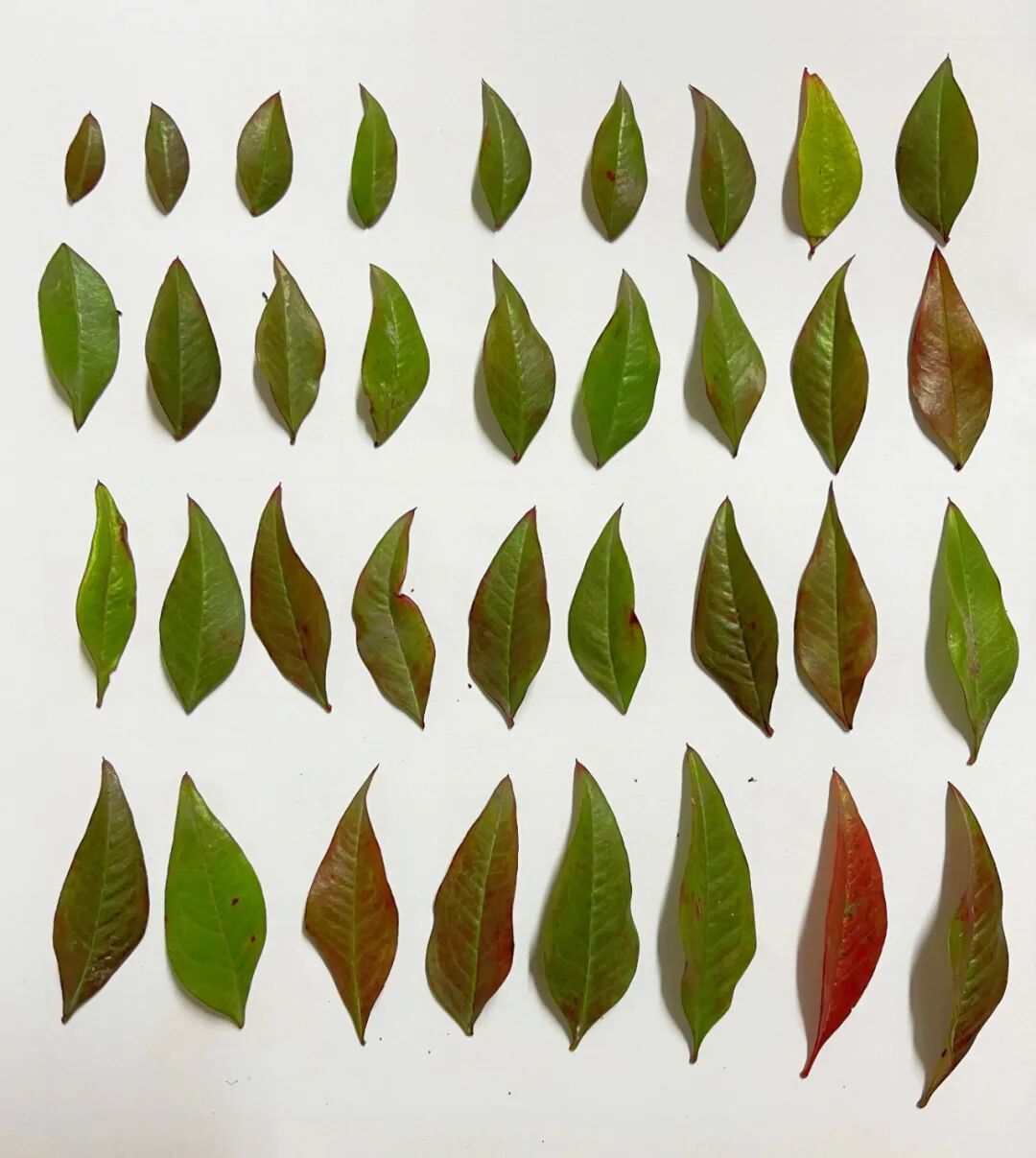 年前买了一棵蓝天竹,每天下班回到家都看到很多叶子掉一地,某天心血来潮把叶子都捡起来大概按大小排列了一下,记录下来。