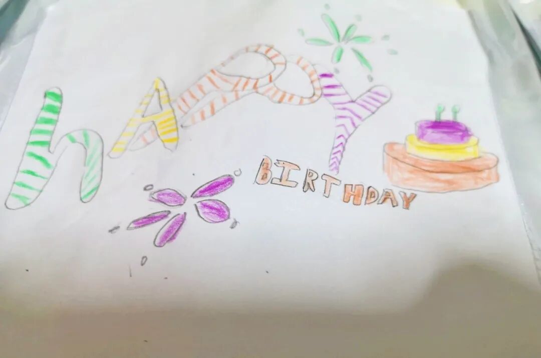 在网上买生日礼物寄给朋友,请求卖家帮忙写一句生日祝福,简单的就好。没想到朋友收到的是一幅小朋友的画,画得好认真,甚至能感觉橡皮擦擦过的铅笔印记。可可爱爱,太甜太暖了。
