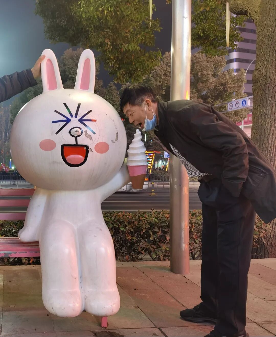 大年初四,毕业一年的我拿着年终奖请爸妈吃了一顿海底捞。他们面对海底捞热情的服务显得拘谨,看到一双几百块上千块的运动鞋会头也不回转身就走。照片是老爸穿着我送他的新运动鞋,和海底捞楼下的玩偶合影。希望他们能一直这样开心。