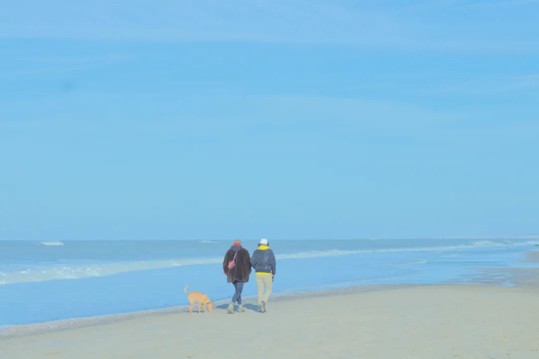 2月1号去海边拍照,忽然回头时看到了这个场景,二人在海浪旁散步,后面还跟着一条犬。
