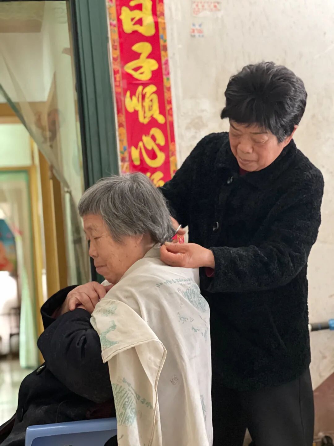 奶奶在楼道门口给邻居奶奶剪头发,奶奶一边「抱怨」着我喜欢偷拍她,一边做表情管理。