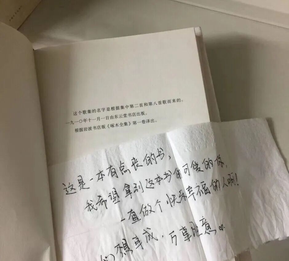 去图书馆借书,这几句话落在柔软的抽纸上的。所有的压力焦虑、研究生毕业的论文折磨都在那一瞬间消逝了。