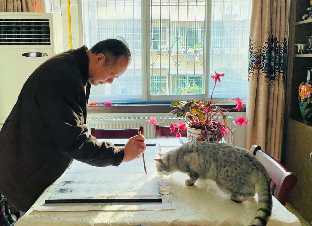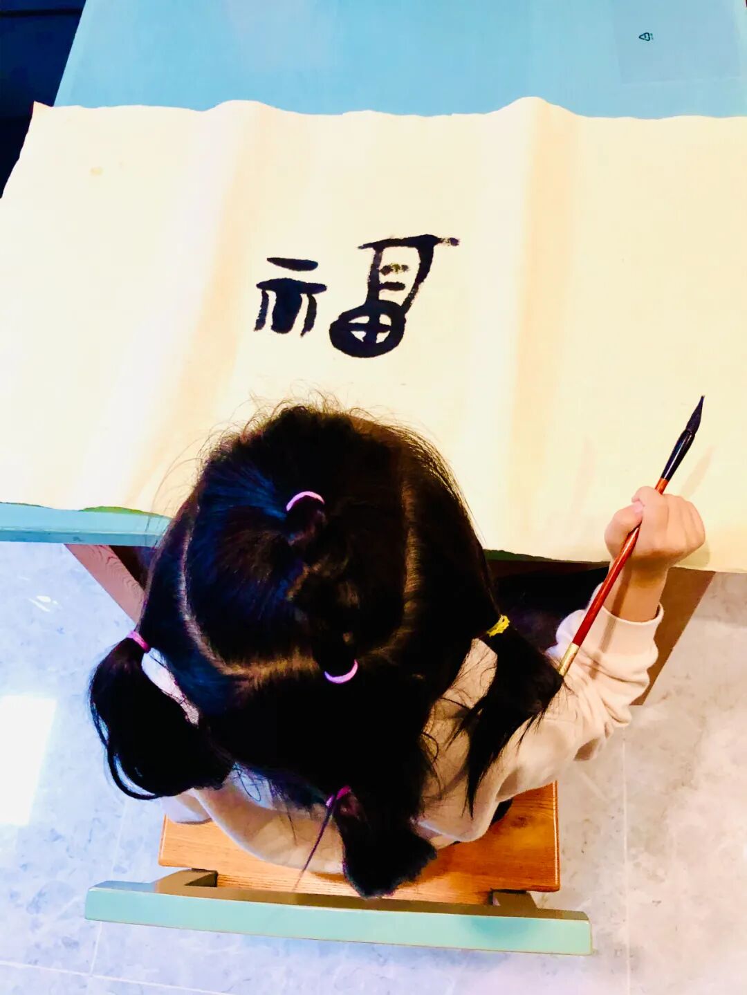 春节前,家里人洗碗扫地各忙各的,四岁的女儿像抓叉子一样拿起我摊在书桌上的毛笔胡乱在纸上涂画,等我忙完才发现她照着窗户上的年画写了一个「福」字。