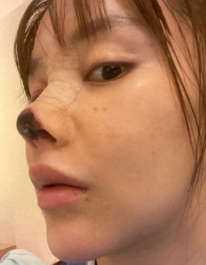 手术是在去年10月进行的,在广州的一家医院,她进行了鼻子耳软骨、肋软骨和膨体手术。手术结束后,她的鼻子发生发炎、排异的状况,后来,隆鼻的软骨被取出,但鼻头已经变黑、部分坏死。