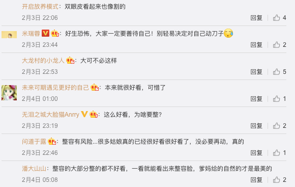 看过太多的谩骂后,我也在反思,我到底错在了哪里?直到现在,我也没有觉得整容这件事本身有什么错,错的是没有判断,一味按照一种审美来整,彻底抹掉了自己,追求同一种美,错的是没有去更了解这件事的风险、副作用、最坏的后果。