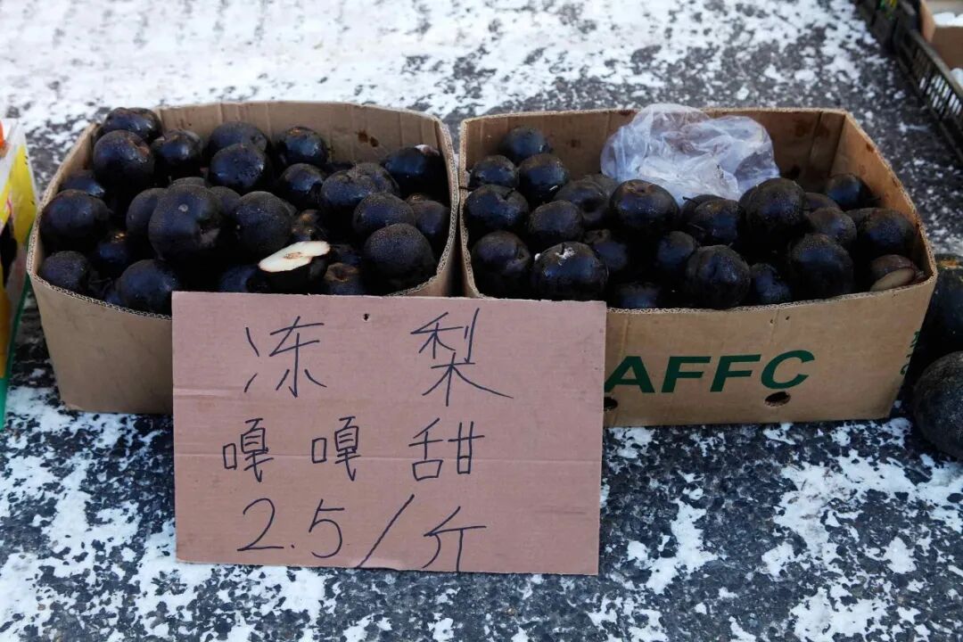 冻梨,顾名思义,就是把普通的白梨冻起来,冻到白梨变成黑梨。几乎每个东北人都吃过冻梨,尤其我爸,每年都买两麻袋直接放在院子(天然冰箱)里。