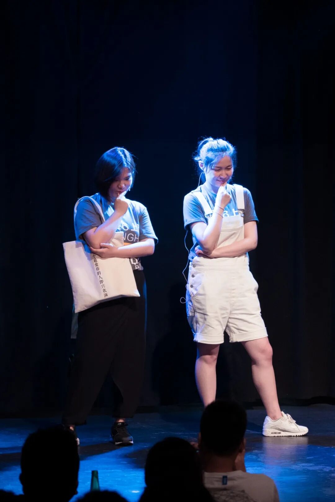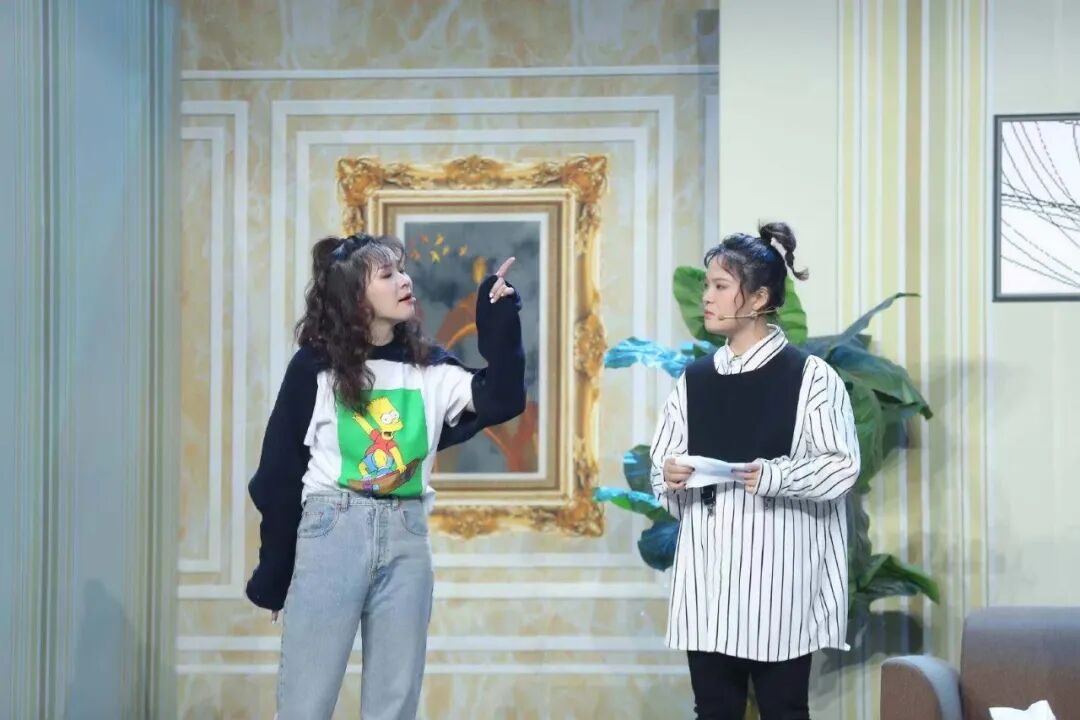 其实,刚加入《今夜百乐门》时,她们是随时可能消失的边缘角色。一位节目核心成员在内部用「其貌不扬」表达对她们的质疑。其他演员多是主流表演院校出身,有编剧写剧本,她们是另辟蹊径的一组,毕业于政法学院,自己创作,最初交上来的本子不到两页纸——但恰恰是根植于即兴戏剧的创作模式,她们那些没有什么语言包袱、主要靠表演呈现的sketch一旦换人演便难以成立。预录时有个开场,在特写镜头前,演员们摆些动作,逐一亮相。唯独她俩由于不是确定人选,坐在台下看。