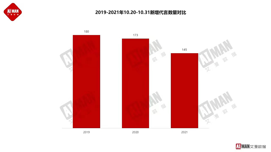 根据艾漫数据统计,自2019年10月20日到10月31日,官宣的明星代言事件有180起,2020年同期有173起,而今年同期仅有145起,较去年下滑了16%。