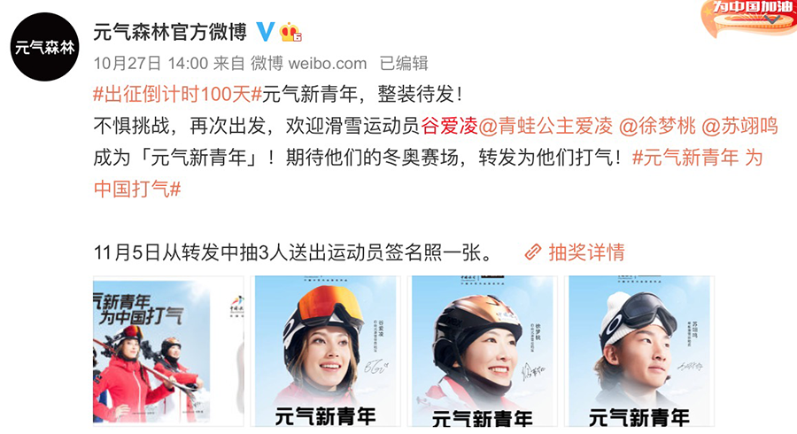 今年,元气森林成为了中国冰雪大会官方指定饮品。10月27日,在冬奥会倒计时100天时,元气森林宣布三位滑雪运动员谷爱凌、徐梦桃和苏翊鸣为“元气新青年”。