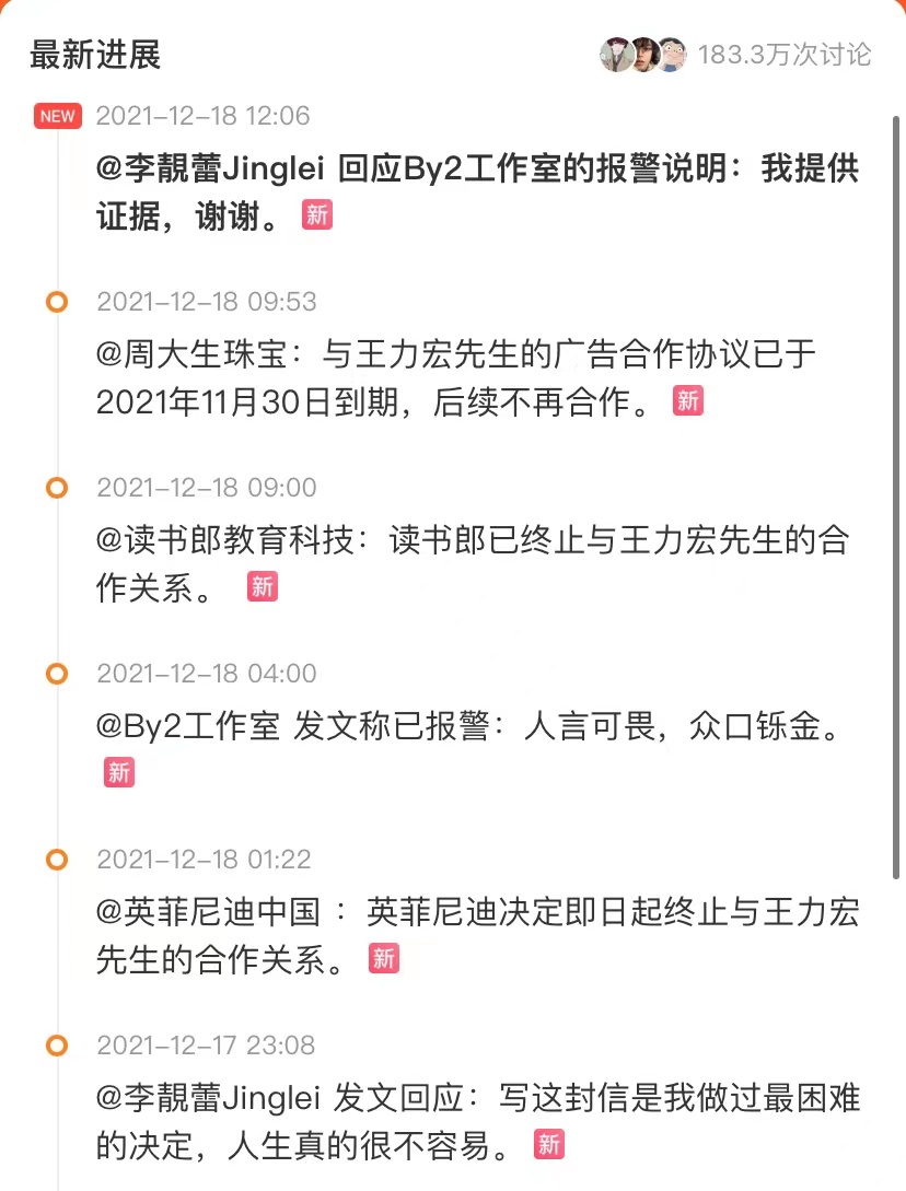12月18日9点,读书郎教育科技宣布,已终止与王力宏的合作。9点53分,周大生珠宝宣布与王力宏合作已到期,并不再合作。