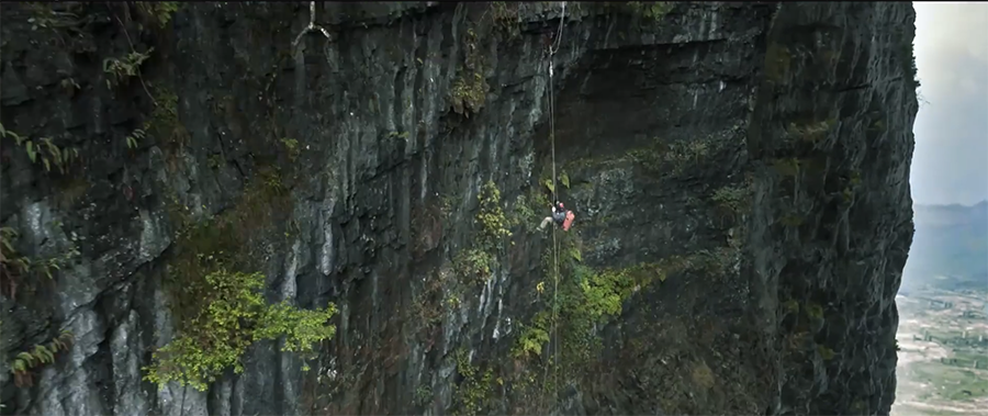 《峰爆》全片视效镜头高达70%,皆由实拍与特效结合方式实现,剧组克服困难,奇景之上再造奇景,沿着洞壁搭出“地下河大悬崖”;在危耸的高山上,将拍摄道具拆整为零,利用索道悬进山洞之中。在人迹罕至的层峦叠嶂间,剧组每日往返四五次,踏出了一条蜿蜒的道来。