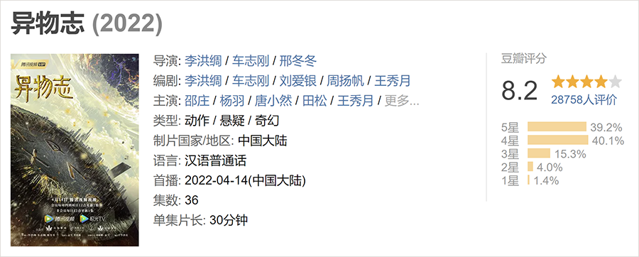 5月7日,《异物志》以豆瓣8.2分收官,是2022年迄今国产剧最高分 (与《超越》并列)。但仅2万人的打分人数,总共1.5亿的播放量,也说明了其依旧未能破圈——就像优映团队这些年的其他高分作品一样。