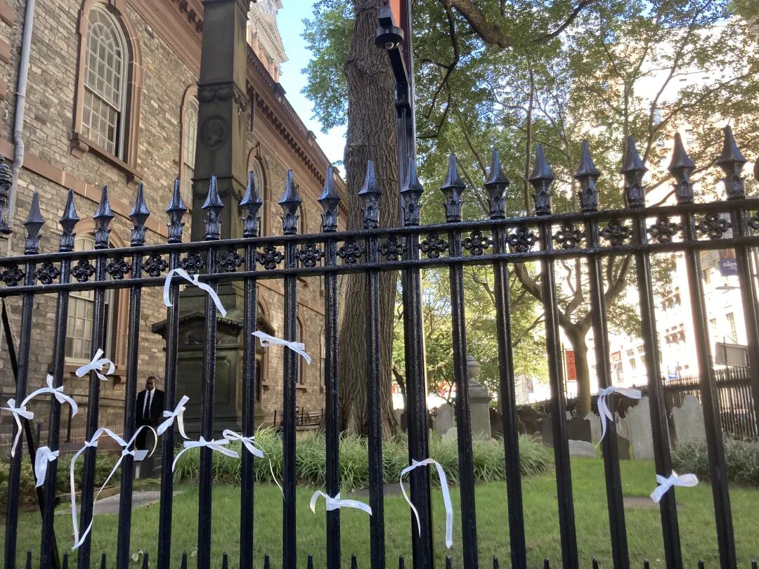2021年9月11日,世贸中心附近的栏杆上绑着白丝带,上面写着「remembrance and healing」 摄影|姚璐