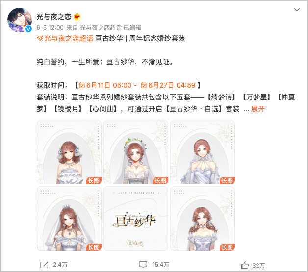 本次私设风波就发酵于《光与夜之恋》周年庆典之「周年纪念婚纱套装」策划。站在玩家角度,一款以模拟恋爱为卖点的女性向游戏,婚纱的重要性不言而喻。
