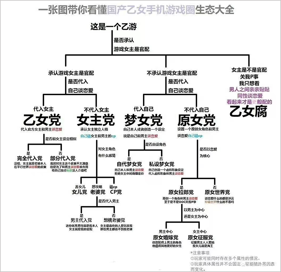 根据相关信息的科普,国产乙女游戏玩家主要分为五大类,分别是承认游戏女主是官配的代入女主的乙女党、不代入女主的女主党;不承认游戏女主是官配的代入自己梦女党、不代入自己原女党;以及不在乎女主是不是官配,给男主角色们拉cp的乙女腐。