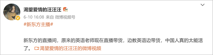 微博上,人们一方面感慨新东方老师带货太卷了,一方面又惋惜曾经在讲台上挥斥方遒的好老师们成了吆喝用户下单的带货主播。一位网友发出感慨,“新东方的直播间,原来的英语老师在直播带货,边教英语边带货,中国人真是太能活了。”