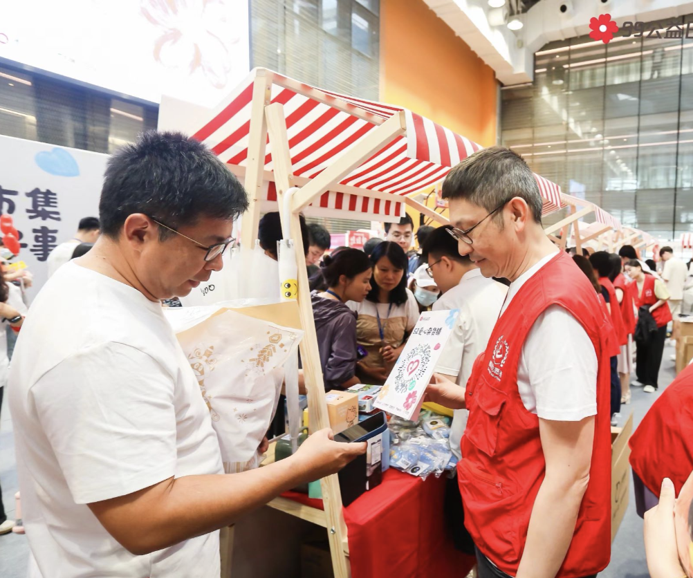 每年的99公益日,腾讯内部也都会有小红花市集,摆上摊儿,公司和员工都拿出自己的物品,挂上可爱的小红花气球,同样是员工们来买,市集所有收入,都用来捐助公益项目。腾讯首席财务官罗硕瀚,也在9月7号这天穿着红马甲,在爱心杂货铺做了两小时志愿者。