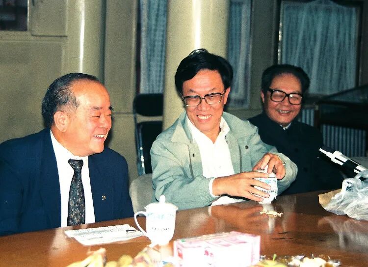 1991年,北京,作家王蒙(中)、红学家冯其庸(右)与新加坡作家周颖南交谈。摄影|方学辉/VCG