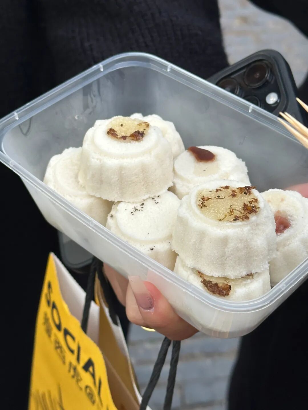 和朋友去美食街,想吃桂花糕但我们肚子实在装不下一整盒了,老板又不单卖。正准备遗憾离场的时候,旁边一个刚结完账的姐姐打开自己的盒子说,我反正也吃不掉,你们一人一个吧。