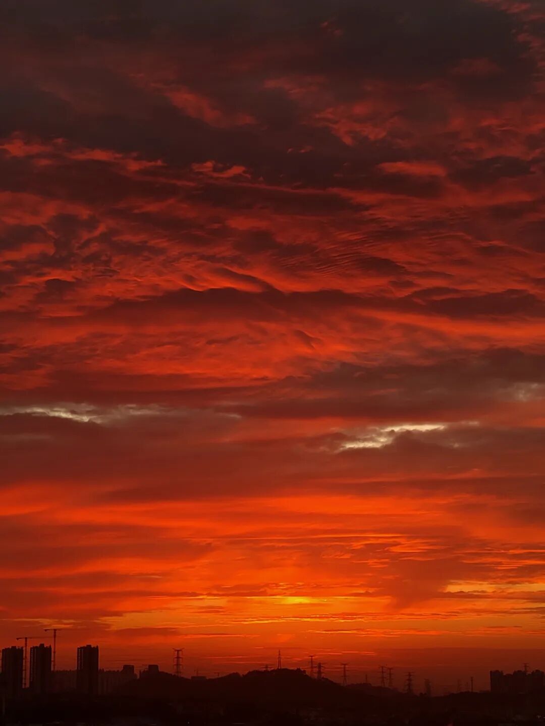 六点半的世纪朝霞:周末的早上被尿憋醒,看到朝霞非常灿烂,上完厕所犹豫了一下要不要拍照,但还是坚持在冷风中穿着睡衣拍下来了。