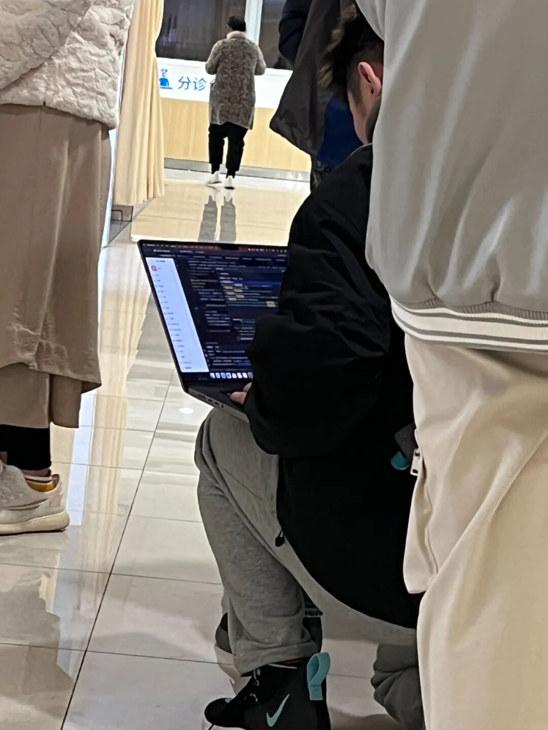 急诊的分诊系统坏了,一位小哥一边帮自己生病的女朋友排队,一边打开电脑开始工作,打工人可真是连一刻都没办法休息呀。这波病毒很凶,祝大家都身体健康。
